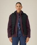 Women’s bodywarmer. Fitted. Sleeveless. High collar. Reverse nylon zip at centre front. Zipped welt pockets with extra grosgrain puller. Elastic tape binding at the armhole. Fully quilted. Side panels for a better shape. Inside seams with binding finish. Bottom hem has an adjustable plastic stopper and elastic cord.